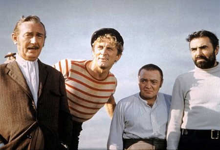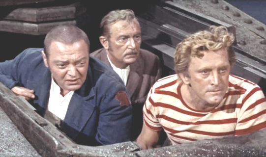 the Kirk Douglas character Ned Land when he is arm in arm with two bar girls