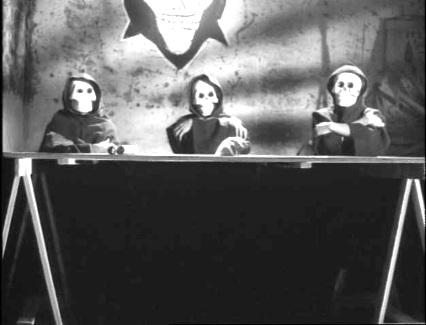 robes and skeleton masks trapping a man that they judge to be a betrayer