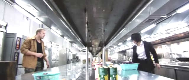 against two break-dancers, a giant Gweilo in a kitchen, using nunchucks against